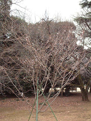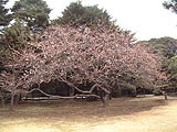 もう1本は日本庭園の翔天(しょうてん)亭の近く。ここは広々とした芝生に面していて風に当たりやすいせいか、まだ咲き始めたばかりだ。若い女性5人が、寒さなんかものともせずに近くの芝生でにぎやかに遊んでいた。