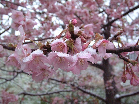 ユースホステル前を7:24に発車するバスに乗る。小雪がだんだん本降りになり、河津駅に着く頃にはこれでもかというくらい激しい降りになる。もう帰ろうか、と思ってしまうほどだ。急いでラジオの天気予報を聞くと、午前中のうちには止むだろうとのこと。まぁ、桜に雪というのも得がたい組み合わせなので雪に負けずに根性を入れて写真を撮る。