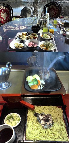 - 朝:宿にて和食バイキング。赤飯、のりの佃煮、らっきょう、ザーサイ、湯豆腐、なめこおろし、じゃこおろし、おから、ひじき入り春雨サラダ、昆布の煮しめ、さつまいも、きんぴらごぼう、ポテトサラダ、フルーツカクテルヨーグルト添え、オレンジジュース、冷たい緑茶。今日も充実のバイキングだ。