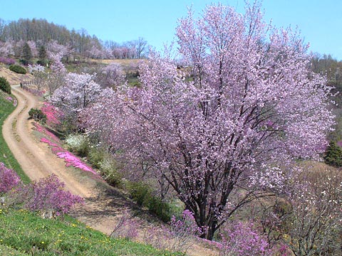 北見フラワーパラダイスも再訪。青空の下、ほんのりピンクのオオヤマザクラが映える。