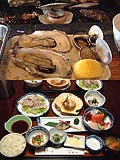 - 夕:宿にて。ごはん、カニの味噌汁、たくあん、ホタテ・鮭・甘エビの刺身・だいこん・海草添え、ホタテのバター焼、サバのしょうゆ漬けの焼き物・はじかみ・梅添え、豚しゃぶ・レタス・もやしなどの野菜添え、いかと切こんぶの和え物、赤貝の和え物、たこの酢の物。
