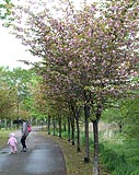 八重桜の並木を散歩する親子。