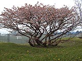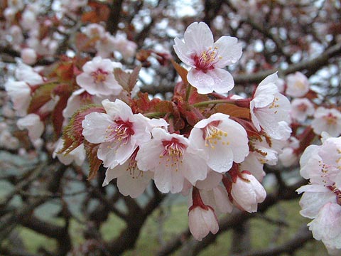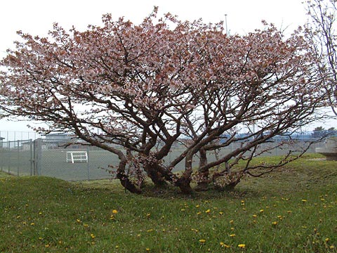 樹高は2〜3m。樹冠の直径は4〜5mある。かなり見事な枝振りだ。花つきはかなりよい方だが、残念ながら今日はやや散り始め。また、西半分の花付きが比較的良くない。柵などがなく、根元付近に踏み跡があることから、おそらく小学生たちが木の下で遊んでいるうちに根っこを踏んでいるのだろう。そのため、特に西半分の木の勢いが落ちているのかも知れないと思う。桜の保護か小学生の自由か、どちらを取るかは難しいところだ。