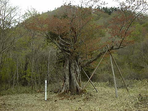 庶野の夫婦桜。別々の根を持つ2本の桜が幹の上のほうで融合している。しかし、左側にある細いほうの幹はほとんど刈れてしまった。幹が融合したあたりから生えている枝も疲労が激しく折れる危険性があるため、役場の方がかなり枝打ちをしたそうだ。