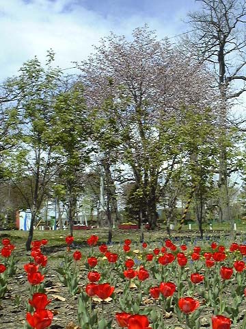 チューリップと桜。 1998.5.10--北海道池田町清見ヶ丘公園 ↑ click photo(78K) |