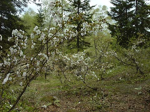 ここに植えられているのはチシマザクラだ。どの木も背が低い。 1998.5.29--北海道東川町旭岳温泉 ↑ click photo(70K) |