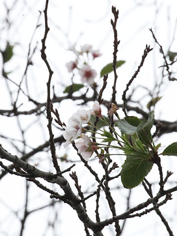 土に塩分があると葉先に水が行きにくくなり、葉が早く落ちることがある。そして、秋の早いうちに葉が落ちると、さっきのオオヤマザクラのように返り咲くことがある、というメカニズムだ。