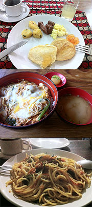 - 朝:ホテルでバイキング。パンケーキ、オレンジママレード、スクランブルエッグ、ソーセージ、ゆでジャガイモ、グレープフルーツジュース、ホットコーヒー。満足な朝食だなぁ。