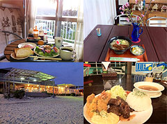 上右は桜と沖縄そば、 下左は砂浜と宿、 下右はおいしいディナープレート |