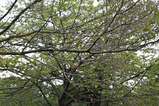 もう1つの都心の秋の桜名所、皇居東御苑に行ってみたところ、2本の十月桜が咲き始めていた。時折外国人も立ち止まり、珍しそうに眺めては写真を撮っている。