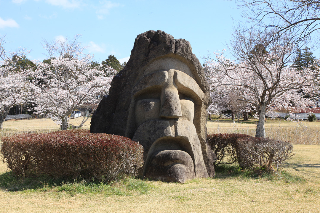 巨大な獅子頭の手前に見頃のヤマザクラがあった。獅子頭は展望台になっていて中に入ることができる。数日後には、獅子頭と八重桜とのコラボレーションも見られるはず。