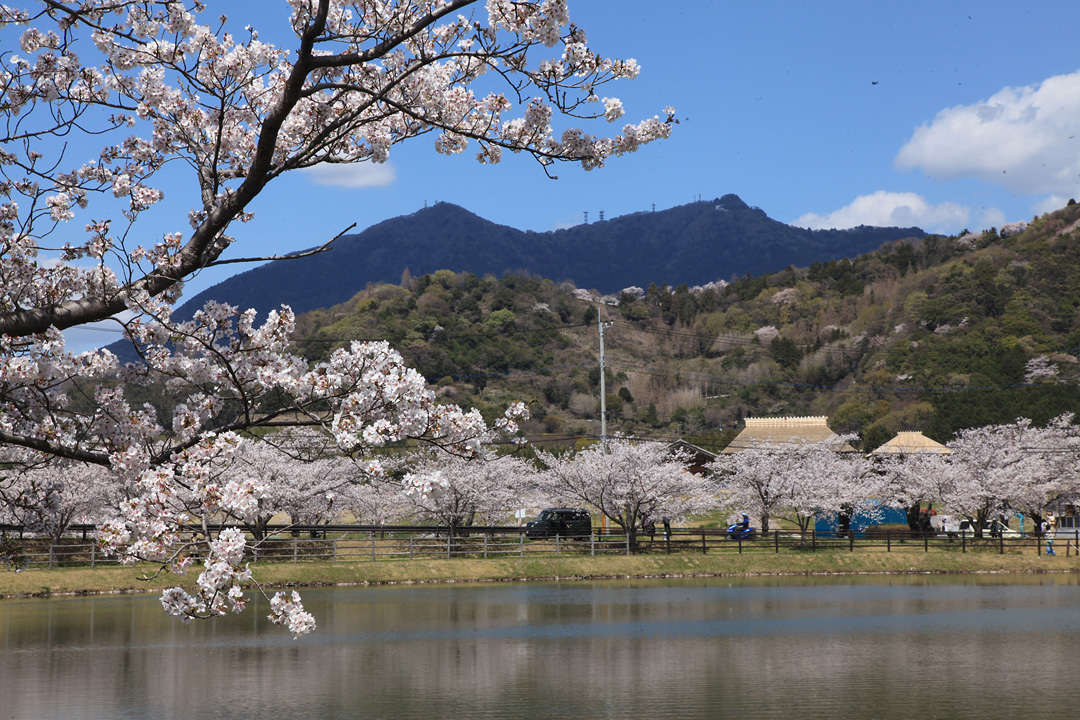 背景の筑波山の山腹にも自生と思われる桜が見える。