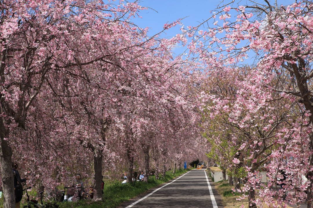 右側の堤には、2重の桜並木があって濃厚に見える。