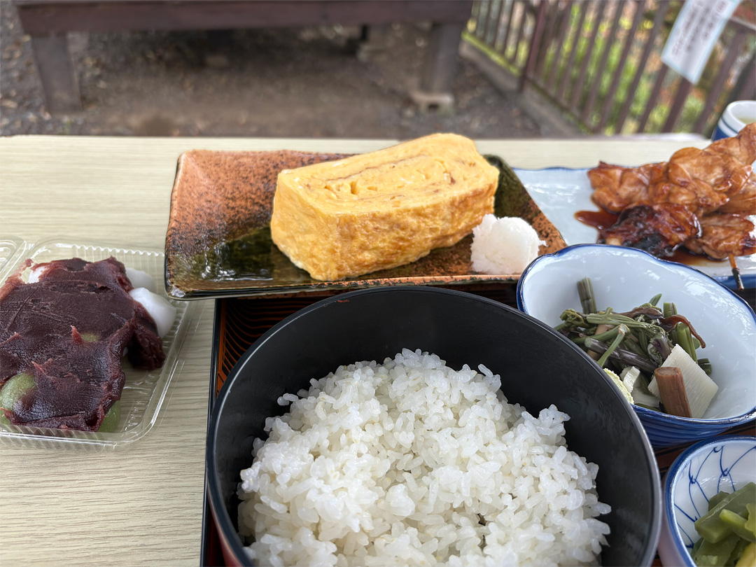 栃木市 太平山の3大名物は、神社に鶏と米を奉納する風習から、焼き鳥、卵焼き、そしておだんご。御料理いづみ家で、焼き鳥と卵焼きのあるB定食(ごはん半分)と、おだんごをいただく。卵焼きはとてもふわふわでほの甘い。焼き鳥はジューシーな焼き具合。おだんごはなかなか食べごたえがあり、あんこは甘すぎない感じ。おいしいお昼でした。 |